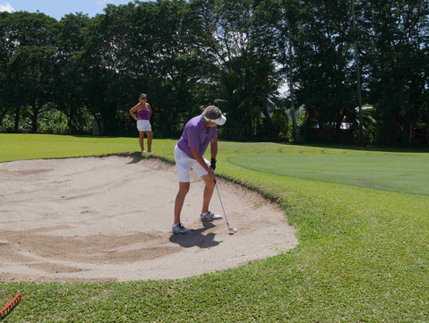 Un superbe 18 trous en bord de lagon, enchâssé au pied de la montagne et arboré de cocotiers, de palmiers, de bougainvillées, d’azalées et d’oiseaux de paradis sera notre décor pour 4 heures de parcours que nous ferons en voiturette électrique, la seule avec 4 places, mais nous tiendrons facilement à 5 avec le sac de golf.