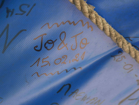 Nous sacrifions à la tradition d’inscrire sous la toile de son auvent le nom de notre bateau.