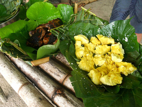 Il faut ensuite chercher des petites feuilles tendres dans lesquelles seront enveloppée les petits gâteaux, composés de pulpe de coco, de farine, de lait de coco et d’un peu de sucre.