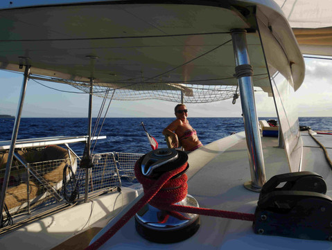 La traversée se fera sans même virer de bord ou changer le réglage des voiles, en route directe pendant 12 heures jusqu’à l’approche de Huanine, après quelques phases de repos et de surveillance alternés.